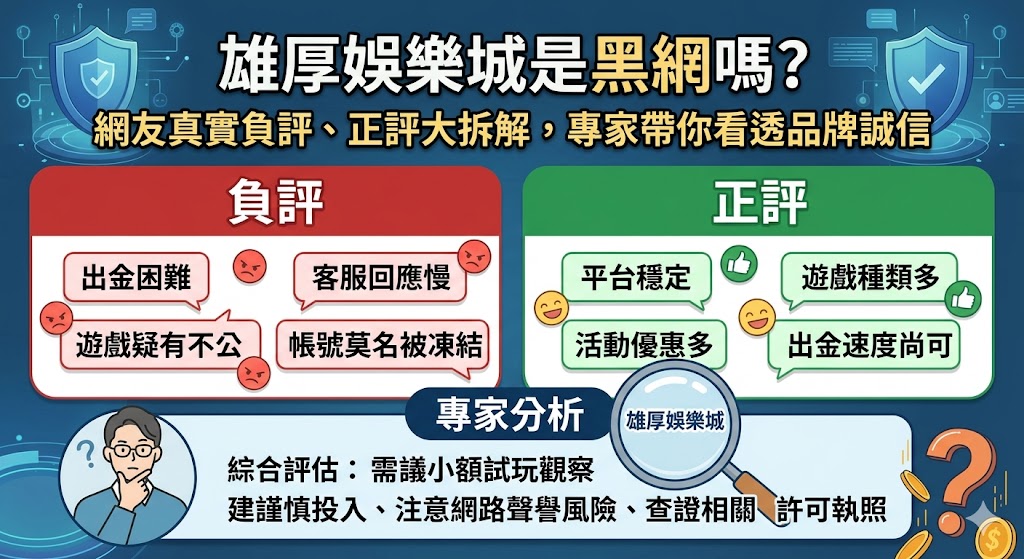 在數位博弈產業飛速發展的今日,玩家對於平台的選擇已不再僅限於遊戲好玩與否,更多的是建立在「安全性」與「品牌信任」之上。雄厚娛樂城作為近期討論度極高的品牌,其評價呈現極端化分布。本篇將由專業編輯角度,深入拆解雄厚娛樂城是否存在黑網疑慮,並針對雄厚娛樂城詐騙傳聞進行實測與資料彙整,協助玩家在進入娛樂城官網前,能有最清晰的風險評估指標。